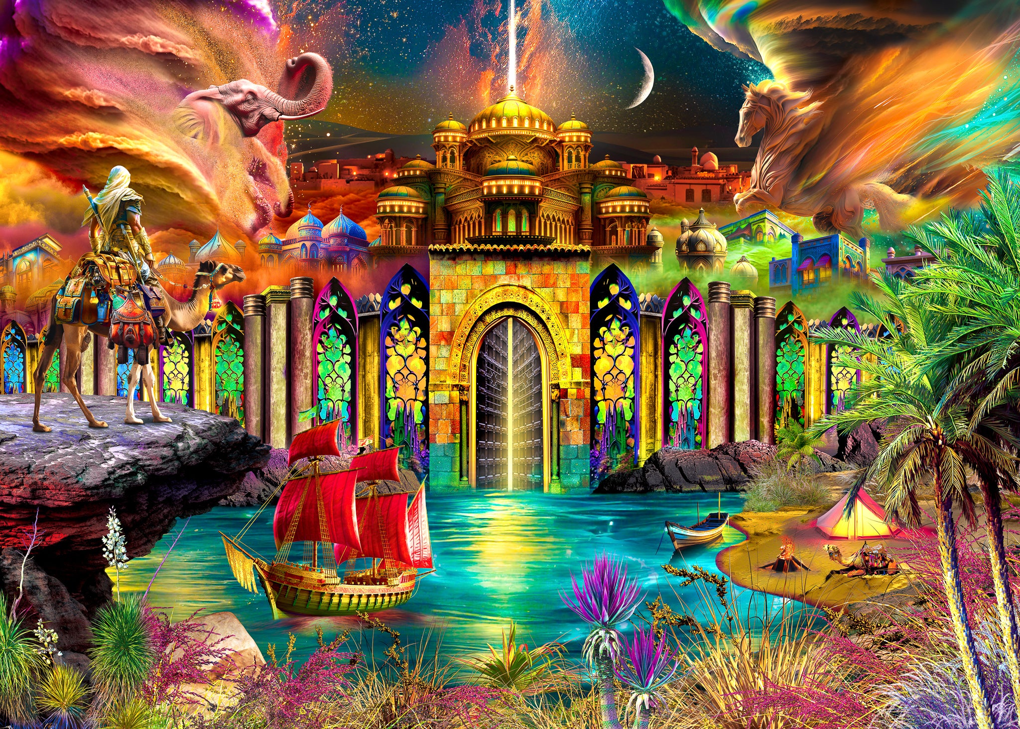 Upon the edge of a cliff overlooking a majestic river, a daring adventurer casts his eyes over a city immersed in the heart of a powerful sandstorm. Beyond the towering mosaic walls, mystical creatures emerge, and a palace comes to life, inviting those who venture near to explore what's hidden beneath. Welcome to the Enchanted Sands.