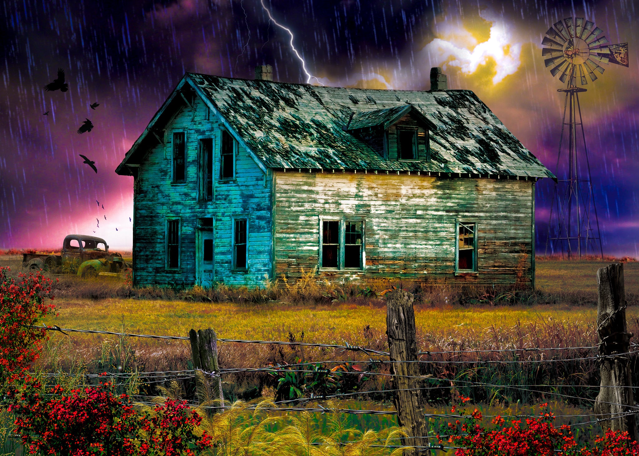 Although this Farmhouse looks and smells abandoned, you are sure you heard something coming from inside. It wasn’t the bolt of lightning or the stirring of the windmill. It couldn’t have been the rain, and it sounded too big to be a bat. In front of you is a twisted barbwire fence. Its purpose is to keep you away. Still, you can’t help but think…Is there someone inside…? Is there something inside...?