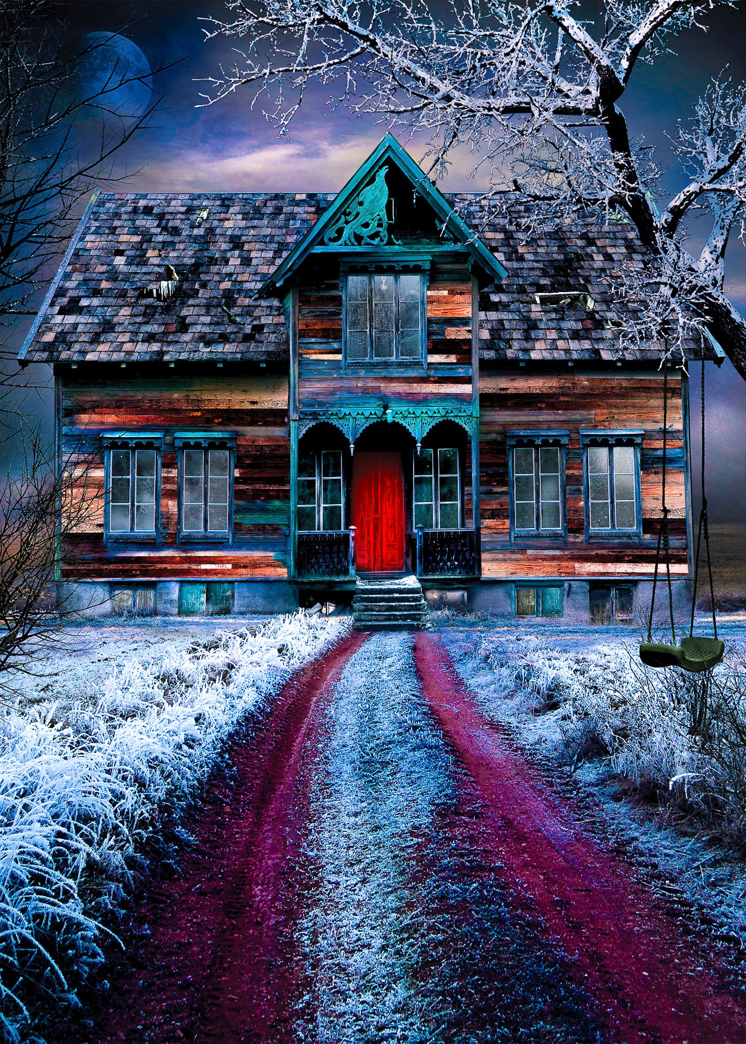 The moon shines down on the icy driveway before you. It’s inviting you to step closer to that blood-red door. The air is still, but the swing beside you sways. All you hear is a squeaky chilling creek, creek, creek. Those frosty windows conceal a secret. A secret you are desperate to know. You shiver in the cold, wondering what that secret could be. There’s only one way to find out…