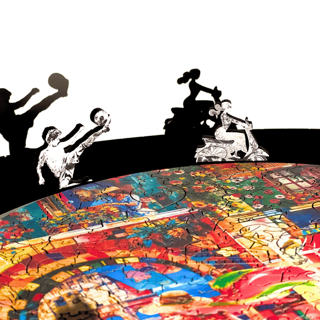 Pirouette Wooden Puzzles offer a puzzling experience unlike any other. Each puzzle is a meticulously crafted work of art, featuring double-sided wooden pieces with vibrant, original artwork on one side and a stunning black-and-white version on the flip side. The pieces are hand-drawn by our Flipsi team, ensuring each puzzle has a unique, tactile feel and engaging shapes, including whimsical pieces that add an extra layer of fun and creativity.